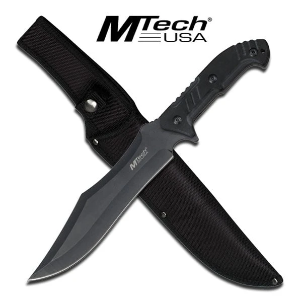 14 Inch Overall Length Mtech Fixed Blade Knife. 5MM Thick Black Stainless Steel Blade. 4.75 Inch Length, 17.55MM Thick Carved Black G10 Handle