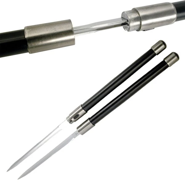 26.75 Inch Closed Length Twin Swords. Twin Swords With A Button Lock Metal Case. Closed Twin Swords