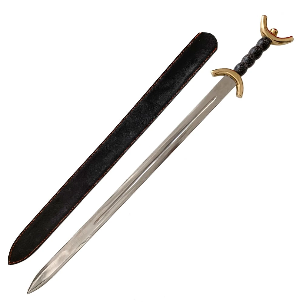 The Celtic War Sword has a stainless steel blade with a fuller running almost its entire length. Half moon shapes with polished brass finishes make up the guard and pommel, together forming the likeness of a stylized human figure. A wood handle, contoured for a more comfortable hold, separates the guard and pommel. A hand-stitched, leather sheath is included with this Celtic weapon, making it easy to safely store the blade or carry it with you on a belt.