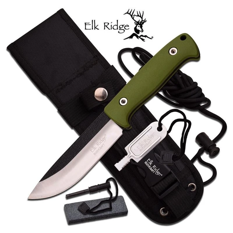 Elk Ridge BushCraft Fixed Blade Hunting Knife. 10.5 Inch Overall Length. 5.3 Inch Stain Finish Stainless Steel Blade. Olive Green Nylon Fiber Handle. Includes 1680D Nylon Sheath