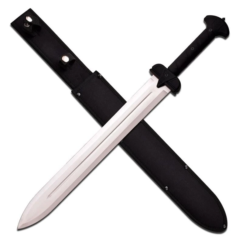 Fantasy Sword 24 Inch Overall Length. 3MM Thick Stain Finish Stainless Steel Blade. Black Nylon Fiber Handle. Includes 600D Nylon Sheath