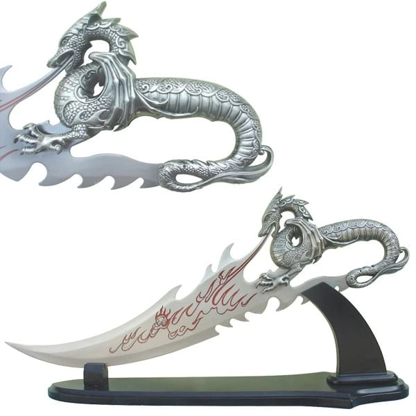 21.5″ overall length with stand. 440 stainless steel blade. Intricate cast metal dragon handle fantasy dagger.