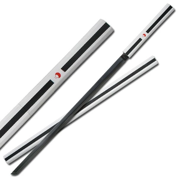 40″ Overall Length Samurai Sword. 26″ Sasuke Ninja Carbon Steel Stick Sword. 11″ Uchiha Clan Ninja Symbol Handle. Includes White Wood Scabbard