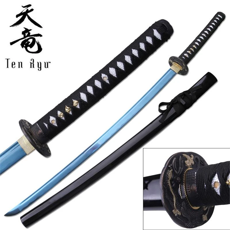 Ten Ryu Hand Forged Samurai Sword. 28 Inch Blue Painted Carbon Steel Blade with Blood Groove. Black Cord and Imitation Ray Skin Wrapped Handle. Includes Black Scabbard